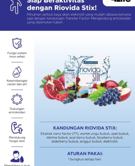 Riovida Stix adalah satu produk dalam rangkaian brand Riovida. Setiap bungkus Riovida Stix memiliki manfaat 4Life Transfer Factor Tri-Factor Formula yang menyokong sistem pertahanan tubuh. Ditambah dengan kandungan buah acai berry, blueberry, elderberry, anggur dan pomegranate serta kandungan elektrolit yang dibutuhkan tubuh.